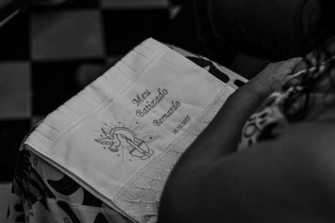 Como fotógrafa, busco sempre o lifestyle — aquela fotografia que não interrompe a vida, mas a celebra como ela é. No batismo do Bernardo, meu foco foi capturar a espontaneidade: o toque suave das mãos dos pais, o olhar curioso do pequeno diante da água sagrada e o aconchego dos abraços que dizem mais do que qualquer palavra.